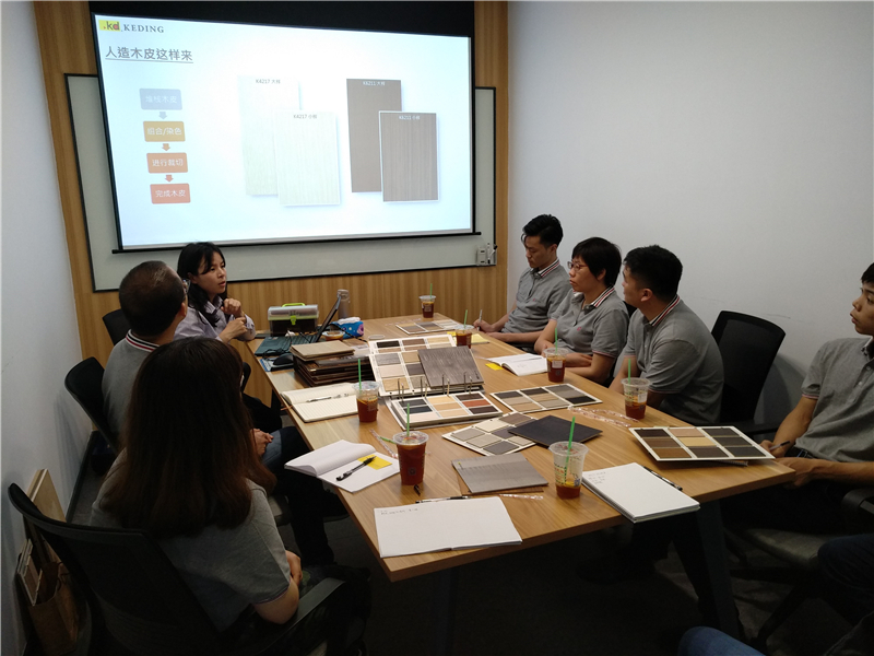 2019年3月22日下午,在珠海環(huán)藝裝飾設(shè)計部開展了《KD木皮板的認識與交流》分享會。本次分享會,邀請到臺灣科定集團珠海分公司章丹燕小姐進行主講。