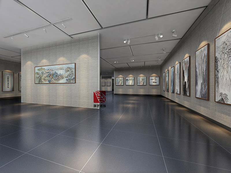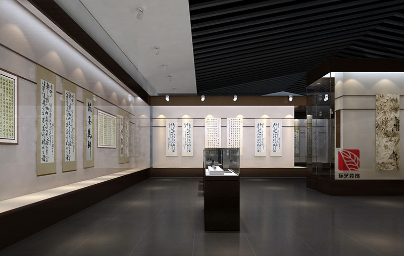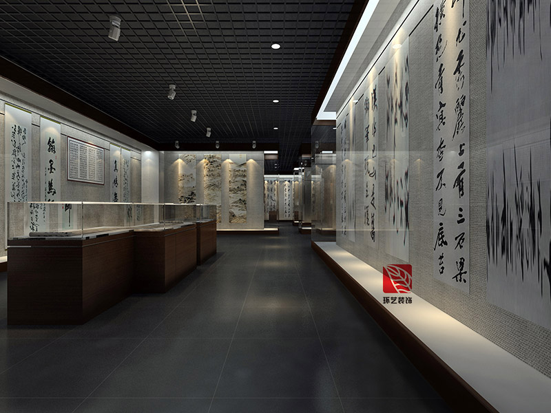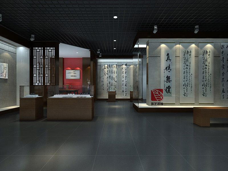 色彩基調(diào):以“黑--白--灰”為主基調(diào),采用厚重感的赭石色彩和淺色系展板、黑色天花地面進(jìn)行有機(jī)結(jié)合,局部灰白色進(jìn)行調(diào)和,形成水墨丹青、幽竹雅靜的藝術(shù)格調(diào)。