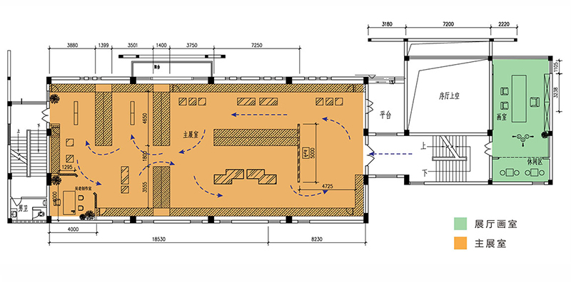 展室以四周壁柜為主,穿插不同的單體展柜,空間布局飽滿,單元分配合理,動(dòng)線流暢。