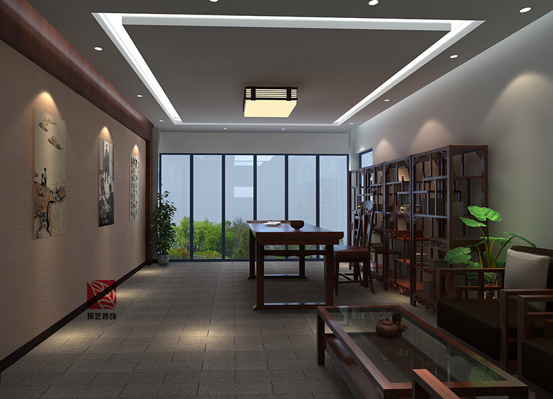 博古架、磁鐵墻、紅木家私、創(chuàng)作案幾、柔和的燈光、窗外的美景,